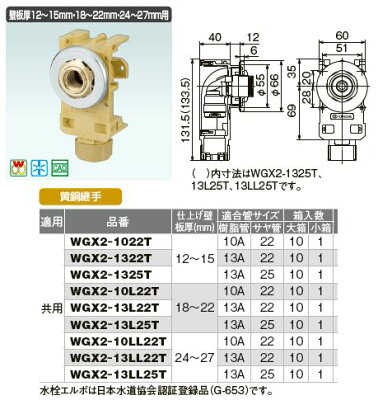 オンダ製作所【WGX2-10L22T】WGX2型 カポリ水栓ボックス Rp1/2ねじ 壁板厚18〜22mm用 黄銅継手 共用 適合管サイズ(樹脂管10A サヤ管22)